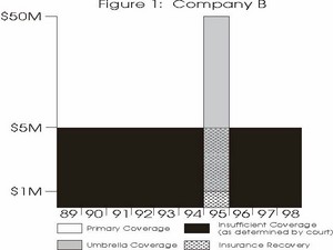 As long as the policyholder gets the benefit of all the coverage it purchased, it doesn't particularly make any difference. Here's the rub, however. Some courts have held that in years in which the policyholder purchased "insufficient" coverage (as determined by a special master appointed by the court), then the policyholder has to contribute to the loss in the same degree as that "insufficiency" bears to the total damages. So, in our example, let's suppose that the special master rules that both companies could have purchased $10,000,000 in coverage for each of the 10 years in question. Horizontal allocation with a penalty for under-insurance would then mandate that Company B receive only 10 percent of its insurance proceeds, or $5,000,000. It is held responsible for the entire $5,000,000 allocated cost in all years except 1995 because it is treated as the "insurer" of up to $10,000,000 in each of those nine years (see Figure 1). Company A, by contrast, would have to participate in the layers excess of $3,000,000 and $4,000,000 in 1989-1992 and would receive only $44,000,000 in spite of the fact that it had purchased $50,000,000 in coverage, all of which was triggered (see Figure 2).
