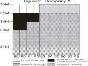 All right, let's try another one. Let's say that your company (Company A) and your competitor across the street (Company B) made an identical product from 1989 to 1999 and, lo and behold, both products developed exactly the same defect, causing liability claims in the amount of $50,000,000 against each company. Further, let's assume that Company A purchased $1,000,000 in primary coverage each year for 10 years. In addition, it bought an additional $2,000,000 of umbrella coverage in 1989 and 1990 (a total of $3,000,000), an additional $1,000,000 in 1991 and 1992 (a total of $4,000,000), and an additional $2,000,000 in 1993 (a total of $6,000,000) for the remaining six years. The total coverage for the 10-year span equaled $50,000,000.